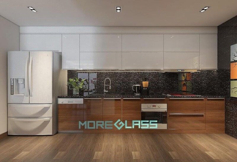 Mẫu kính ốp bếp màu đen kim sa với tông màu đen sang trọng kết hợp với hàng nghìn hạt kim sa lấp lánh tạo nên một không gian bếp nổi bật