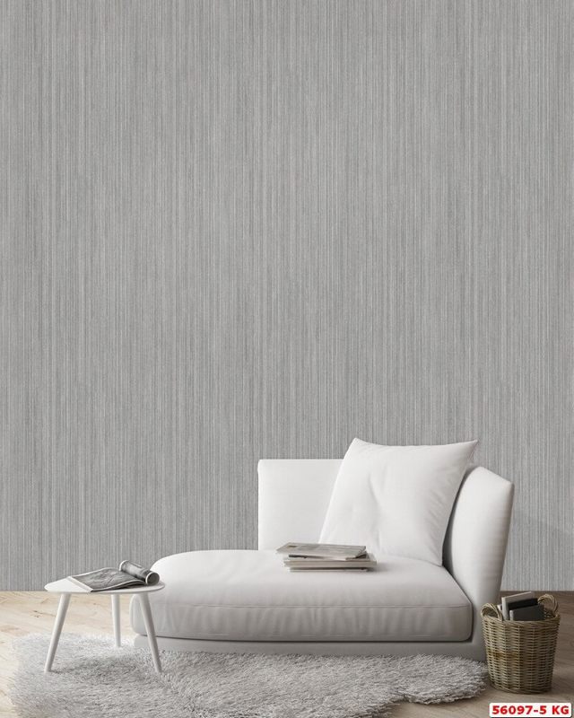 Phối cảnh không gian nội thất hiện đại được trang trí bằng sản phẩm giấy dán tường hiện đại màu xám đậm vân kẻ sọc cao cấp này