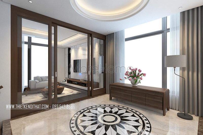 Thiết kế nội thất phòng khách hiện đại, đẹp kết hợp gỗ ốp tường tạo điểm nhấn ấn tượng cho căn hộ chung cư.