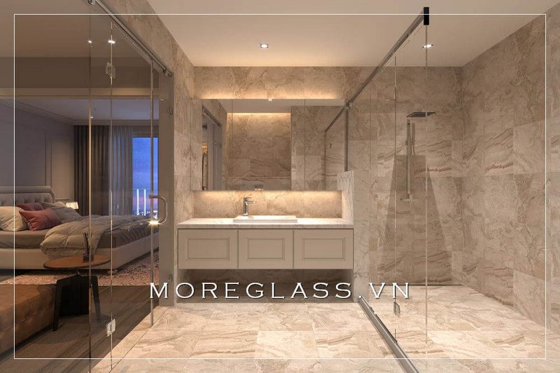 Sử dụng kính cường lực cao cấp để ngăn cách giữa hai không gian phòng ngủ và phòng tắm hiện đại sử dụng đá ốp tường màu trắng vân mây lôi cuốn.