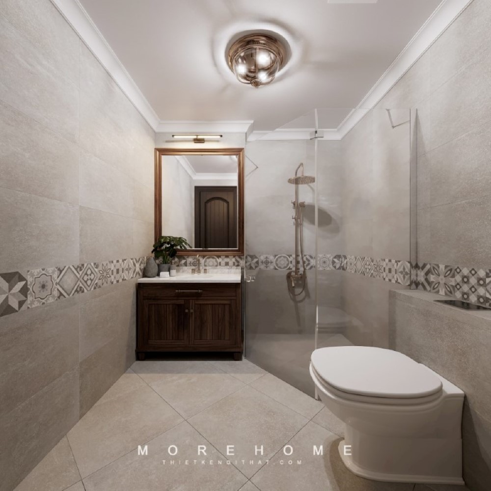 Thiết kế phòng tắm phong cách hiện đại với cửa kính cường lực giúp không gian thư giãn trở nên rộng rãi hơn.